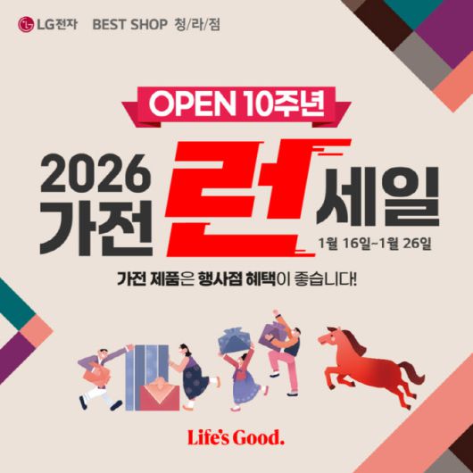 [이데일리 이윤정 기자] 프리미엄 가전매장 LG전자 베스트샵 청라점이 개점 10주년을 맞아 1월 16일부터 1월 26일까지 대규모 할인 행사인 ‘2026 가전 런 세일’을 실시한다.