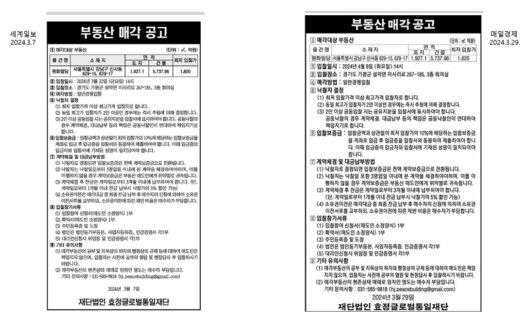 2024년 3월 세계일보와 매일경제신문에 게재한 부동산 매각공고. |