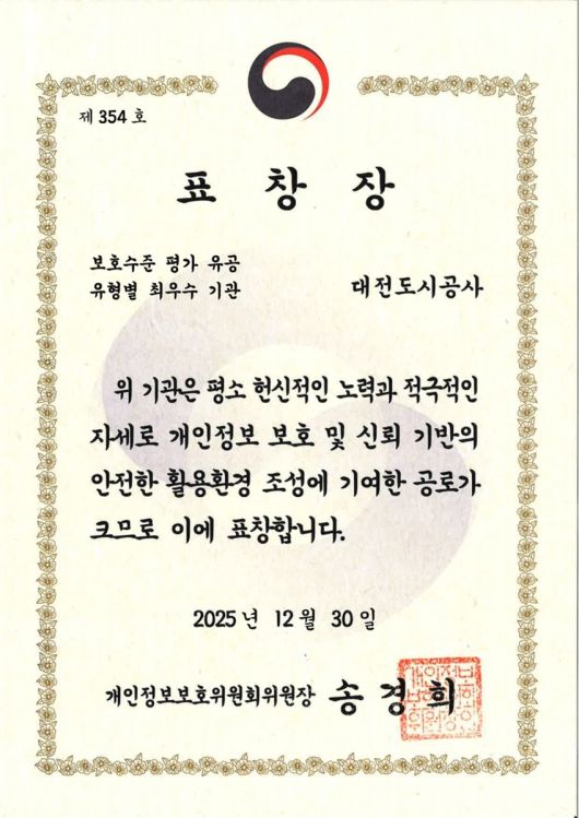 (대전=국제뉴스) 이규성 기자 = 대전도시공사가 개인정보보호위원회가 주관한 '2025년 공공기관 개인정보 보호수준 평가'에서 최우수 기관으로 선정돼 개인정보보호위원회 위원장 표창을 받았다.