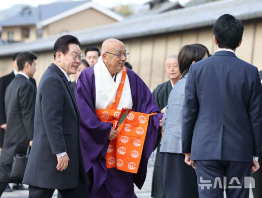 [나라=뉴시스] 고범준 기자 = 이재명 대통령이 14일(현지 시간) 다카이치 사나에 일본 총리와 친교 행사를 위해 나라현 호류지에 도착하고 있다. 2026.01.14. bjko@mewsis.com