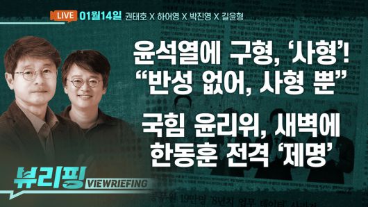 ‘내란수괴’ 윤석열 사형 구형…‘2인자’ 김용현은 무기징역 / 국힘 윤리위, 새벽에 한동훈 제명…장동혁 지도부 결정만 남아 / 이 대통령, ‘중수청·공소청’ 두고 당 내 숙의·의견수렴 지시 / ‘중수청·공소청’ 반발 범여권 토론회…주요 쟁점은? / ‘서부지법 폭동 배후 의혹’ 전광훈 구속…‘폭력 선동’ 혐의 / 이혜훈 향해 ‘자진 사퇴’ 요구 빗발…청문회 19일 확정 / 한·일 정상회담 종료…이 대통령-다카이치, 주요 논의 내용은? 오늘(01월 14일) 뷰리핑 많은 시청바랍니다.