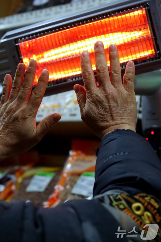 (대구=뉴스1) 공정식 기자 = 매서운 한파가 맹위를 떨친 14일 오전 대구 북구 칠성시장에서 영업을 준비하던 상인이 꽁꽁 언 손을 전기난로에 녹이고 있다. 2026.1.14/뉴스1