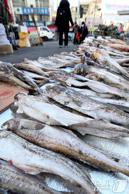 (대구=뉴스1) 공정식 기자 = 매서운 한파가 맹위를 떨친 14일 오전 대구 북구 칠성시장 난전에 나온 동태가 꽁꽁 얼어 있다. 2026.1.14/뉴스1