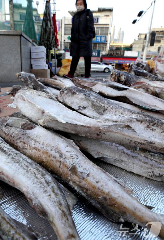 (대구=뉴스1) 공정식 기자 = 매서운 한파가 맹위를 떨친 14일 오전 대구 북구 칠성시장 난전에 나온 동태가 꽁꽁 얼어 있다. 2026.1.14/뉴스1jsgong@news1.krCopyright ⓒ 뉴스1. All rights reserved. 무단 전재 및 재배포, AI학습 이용 금지.