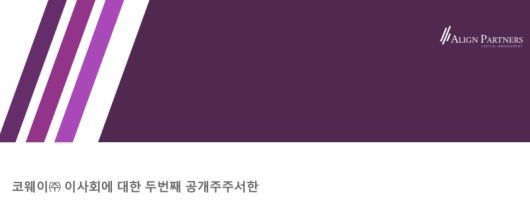얼라인파트너스는 지난달 15일 코웨이 이사회에 주주가치 제고를 위한 7가지 제안을 담은 두번째 공개주주서한을 발송했다고 14일 밝혔다. 이를 반영한 수정 기업가치 제고 계획을 오는 30일까지 발표할 것을 요청했다.