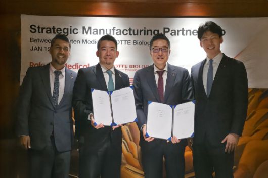 (왼쪽부터) 압흐짓 바티아 라쿠텐메디칼 최고운영책임자, 미나미 마에다 라쿠텐메디칼 사장, 제임스박 롯데바이오로직스 대표, 신유열 롯데바이오로직스 대표. [사진=롯데바이오로직스 제공] |