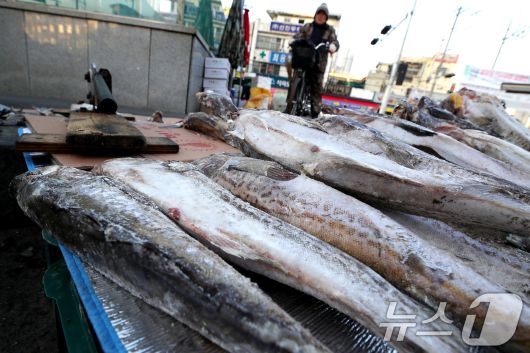 (대구=뉴스1) 공정식 기자 = 매서운 한파가 맹위를 떨친 14일 오전 대구 북구 칠성시장 난전에 나온 동태가 꽁꽁 얼어 있다. 2026.1.14/뉴스1