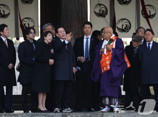 (나라(일본)=뉴스1) 이재명 기자 = 이재명 대통령과 다카이치 사나에 일본 총리가 14일 일본 나라현 호류지를 방문해 후루야 쇼우카쿠 호류지 관장의 설명을 듣고 있다. 2026.1.14/뉴스12expulsion@news1.krCopyright ⓒ 뉴스1. All rights reserved. 무단 전재 및 재배포, AI학습 이용 금지.