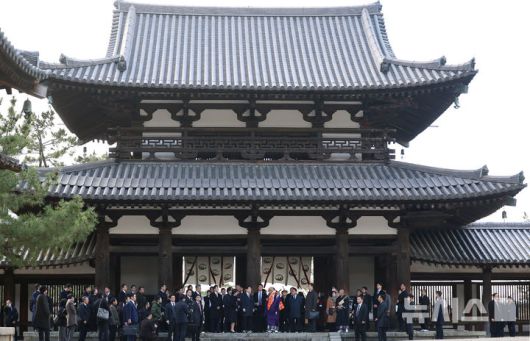 [나라=뉴시스] 고범준 기자 = 이재명 대통령이 14일(현지 시간) 다카이치 사나에 일본 총리과 함께 나라현의 대표 문화유적지인 호류지를 둘러보고 있다. 2026.01.14. bjko@mewsis.com
