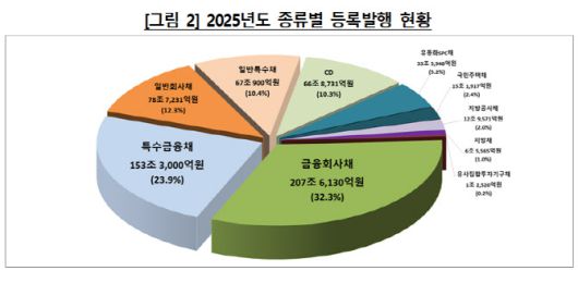 종류별로는 금융회사채가 207조 6130억원으로 전체의 32.3%를 차지해 가장 큰 비중을 기록했다. 이어 특수금융채(153조 3000억원), 일반회사채(78조 7231억원), 일반특수채(67조 9000억원) 등이 뒤를 이었다.
