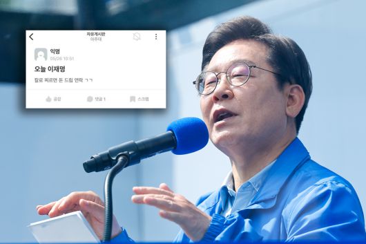 21대 대선 당시 이재명 후보 테러 청부 글을 올린 대학생에게 검찰이 징역 4년을 구형했다. 범행을 자수한 A 씨는 반성하며 선처를 호소했으며, 선고 공판은 오는 29일 수원지법에서 열린다. 뉴스1·에브리타임 갈무 |