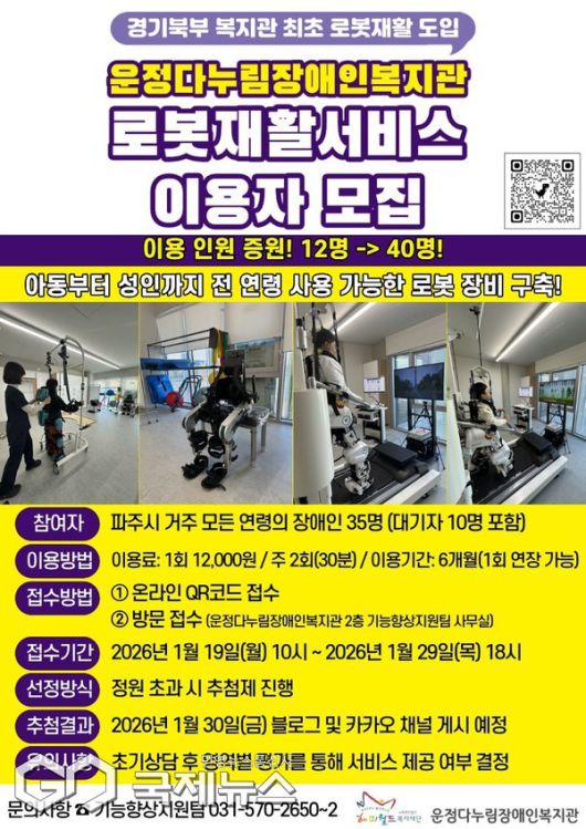 2025년 9월 개관한 운정다누림장애인복지관은 경기북부 최초로 지면 보행형 로봇 재활 훈련 장치(워크봇)와 웨어러블 로봇 등 최첨단 재활 장비를 도입해 운영 중이다. 해당 장비는 뇌병변·발달·지체장애 등으로 보행에 어려움을 겪는 장애인을 대상으로 로봇 기반 보행훈련을 제공해, 올바른 보행 유형 형성과 근신경 재교육을 효과적으로 지원하고 있다.