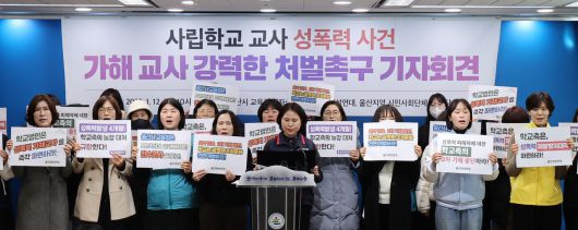 12일 울산시교육청에서 울산여성연대 등 시민사회단체가 한 사립학교에서 발생한 성폭력 사건 가해 교사에 대한 처벌을 촉구하는 기자회견을 하고 있다. [연합] |