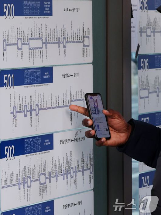 (서울=뉴스1) 황기선 기자 = 서울 시내버스 총파업 이틀차인 14일 오전 서울역 버스환승센터에서 외국인 관광객이 버스 노선도를 살펴보고 있다. 2026.1.14/뉴스1