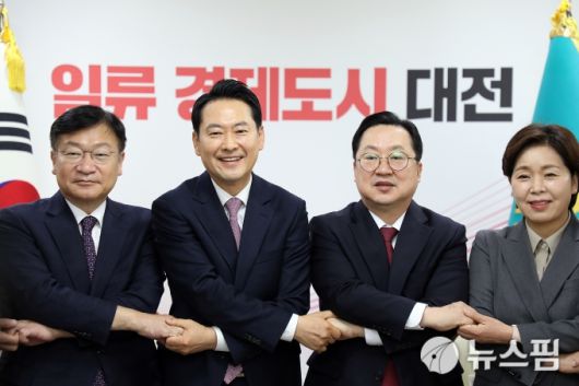 [대전=뉴스핌] 오종원 기자 = 장동혁 국민의힘 당대표가 14일 오전 대전을 방문해 이장우 대전시장과 면담을 갖고 대전·충남 행정통합을 둘러싼 정책 방향과 추진 과제에 대해 논의했다. 사진은 공개 회담 후 손을 맞잡으며 기념사진을 촬영하고 있는 이장우 시장(오른쪽 두번째)과 장동혁 당대표(오른쪽 세번째) 모습. jongwon3454@newspim.com