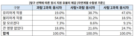 14일 진학사가 2026학년도 정시 지원 수험생 1649명을 대상으로 조사한 결과, 고교 이수과목 기준 자연계열 수험생 980명 가운데 과탐 2과목을 응시한 수험생의 54.8%가 “탐구 선택이 정시 지원에서 불리하게 작용했다”고 답했다. 자연계열임에도 사탐 2과목을 선택한 수험생은 47.6%가 “유리하게 작용했다”고 응답해 뚜렷한 대조를 보였다.
