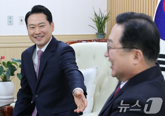 이장우 대전시장과 대화하는 장동혁 대표