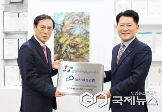 (밀양=국제뉴스) 홍성만 기자 = 경남 밀양시시설관리공단은 지난 13일 공단 이사장실에서 중소벤처기업인증원으로부터 획득한 '노사상생 인증(LMBC)' 현판 수여식을 개최했다.