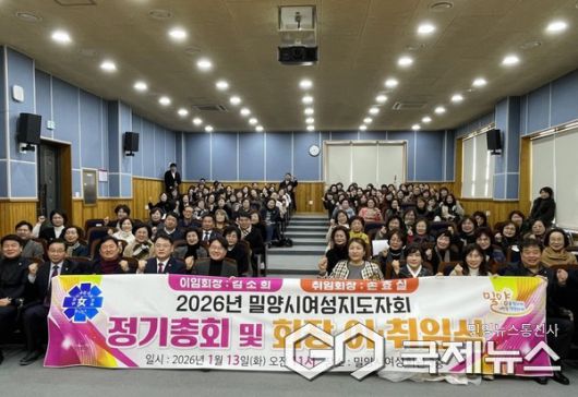 (밀양=국제뉴스) 홍성만 기자 = 경남 밀양시여성지도자회는 지난 13일 여성회관 대강당에서 회원과 내빈 등 80여 명이 참석한 가운데 2026년 정기총회 및 회장 이·취임식을 개최했다.