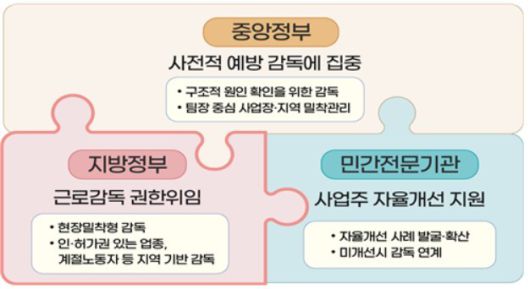 감독 사각지대 최소화를 위해 지방정부에 감독권한 위임도 추진한다. 감독 대상은 30인 미만 사업장 중에서 중앙-지방정부 협의회를 통해 사전 협의해 선정한다. 중앙정부는 지방 감독시스템이 조기에 안착할 수 있도록 조직‧인력 등 운영 기준을 마련·제공하는 등 최대한 지원하면서, 매년 감독 결과를 평가하고 평가 결과에 따라 예산·인력 등 인센티브도 제공한다.
