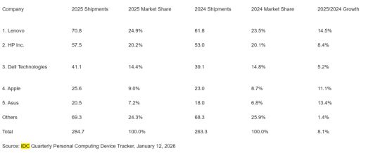 출하량 기준으로는 레노버가 2025년 한 해 동안 7,080만 대의 PC를 판매하며 전년 대비 14.5% 성장, 시장 점유율 24.9%로 1위를 차지했다. HP와 델은 각각 20.2%, 14.4%의 점유율로 2위와 3위에 올랐다.