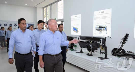 (서울=뉴스1) = 정의선 현대차그룹 회장이 지난 13일(현지시간) 현대차 인도 푸네공장에서 임직원들과 함께 자동차 부품을 점검하고 있다. (현대차·기아 제공. 재판매 및 DB 금지) 2026.1.14/뉴스1urodoct2@news1.krCopyright ⓒ 뉴스1. All rights reserved. 무단 전재 및 재배포, AI학습 이용 금지.