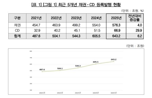 14일 예탁원이 발표한 ‘2025년 채권·CD 전자등록 발행 현황’에 따르면, 지난해 채권·CD 전자등록 발행 규모는 643조 2000억 원으로 집계됐다. 이는 전년(605조 5000억 원) 대비 6.2% 증가한 수치다. 이 가운데 채권 발행은 576조 3000억 원으로 4.0% 늘었고, CD 발행은 66조 9000억 원으로 1년 새 29.9% 급증했다.