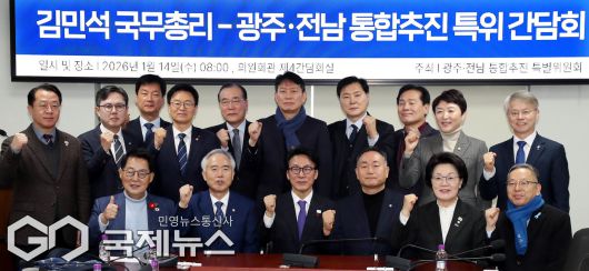 (서울=국제뉴스) 김민석 국무총리 14일 오전 서울 여의도 국회 의원회관에서 열린 국무총리-더불어민주당 광주·전남 통합추진 특위 간담회에서 참석자들과 기념촬영하고 있다./사진=이용우 기자