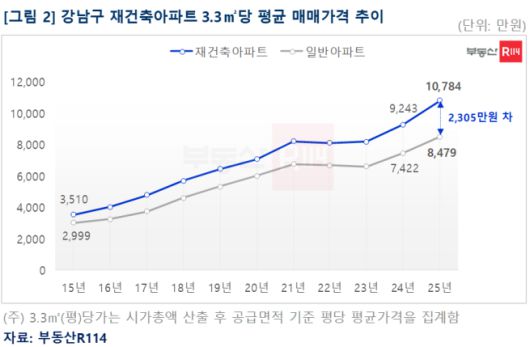 가격 상승을 이끈 동력은 재건축 아파트였다. 특히 강남구는 재건축 단지를 중심으로 강세가 두드러졌다. 지난해 강남구 재건축 아파트 매매가격은 연간 24.35% 상승하며 평당 평균가가 1억 원을 처음 돌파했다. 이는 2024년 평균 가격(9243만 원)보다 1541만 원 오른 수준이다. 10년 전 평당 가격(3510만 원)과 비교하면 3배 이상 상승했다. 일반 아파트와의 가격 격차도 2305만 원에 달했다.