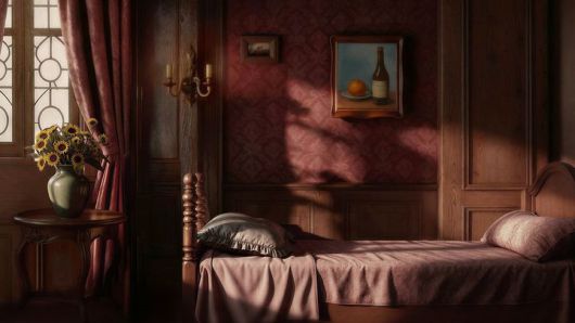홍애린, <브랫(Brat)>, 2026,75인치모니터, 3D애니메이션(반복재생),프린세스메이커2배경세트디자인,화병,사진:작가제공 *재판매 및 DB 금지 |