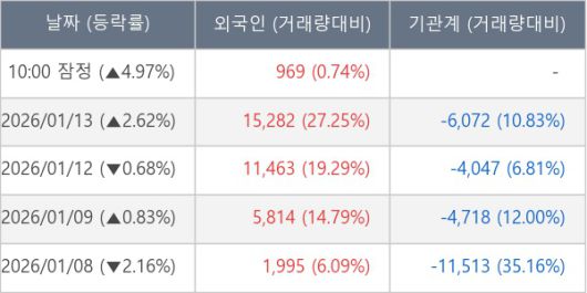 [서울=뉴스핌] 로보뉴스 = 14일 10시 15분 현재 SJM(123700)은 전일 대비 4.97% (현재가 3,905원) 상승했고, 외국인이 최근 6일 연속 순매수(누적 47,165주, 잠정) 행진을 하고 있다.