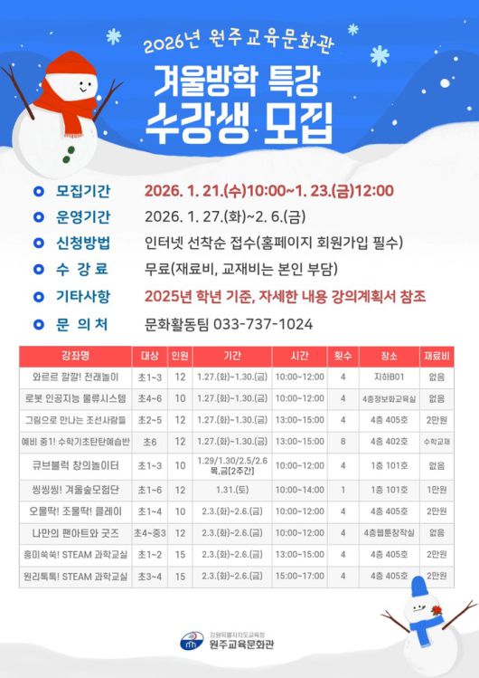 [스포츠서울ㅣ춘천=김기원기자]강원특별자치도교육청 원주교육문화관(관장 용석태)은 1월 21일(수)부터 23일(금)까지 관내 초·중학생을 대상으로 겨울방학 특강 수강생을 모집한다.