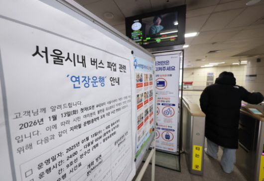 서울 시내 버스 파업이 이어지고 있는 14일 오전 서울 시내 한 역사에 지하철 연장 운행 안내문이 붙어 있다.(사진=연합뉴스) |