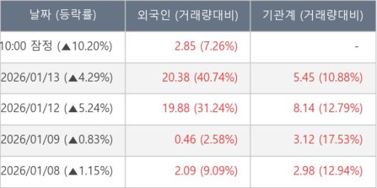 [서울=뉴스핌] 로보뉴스 = 14일 10시 15분 현재 한전기술(052690)은 전일 대비 10.20% (현재가 117,800원) 상승했고, 외국인이 최근 8일 연속 순매수(누적 63.46만 주, 잠정) 행진을 하고 있다.