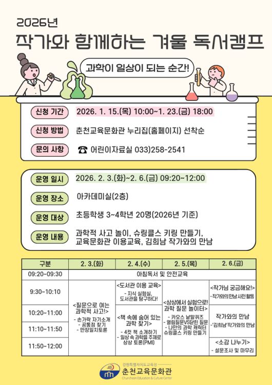 참가 신청은 1월 15일(목)부터 23일(금)까지이며, 춘천교육문화관 누리집을 통해 선착순 20명을 모집한다.
