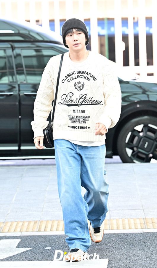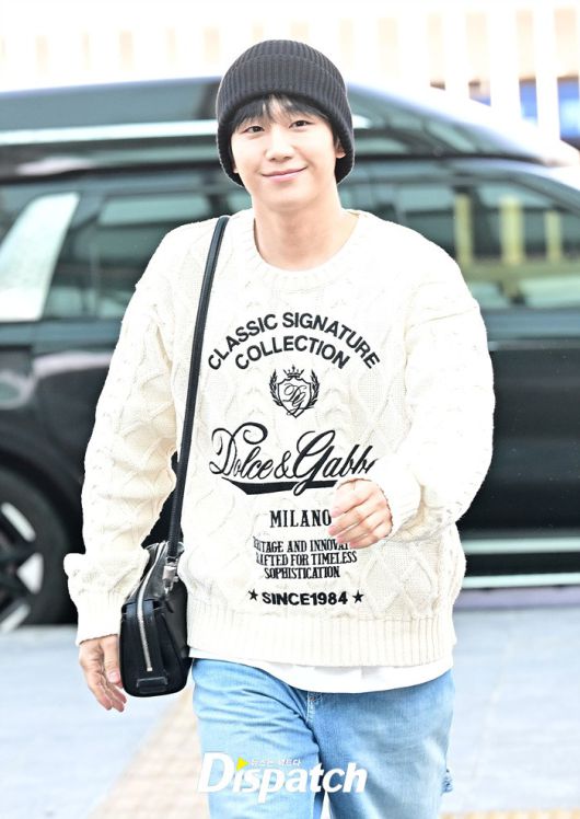 정해인은 아이보리 컬러의 니트와 데님진으로 캐주얼한 공항패션을 완성했다. 비니로 완성한 센스있는 스타일링도 돋보였다.