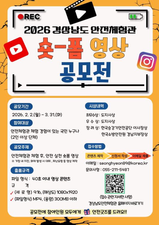 주제는 '안전체험관 체험활동 기반 안전 실천 숏폼 영상'으로, 화재 대피와 재난 대응, 생활 안전 등 체험을 통해 익힌 안전 행동요령을 자유롭게 담으면 된다.