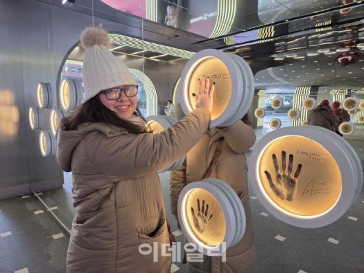 영국인 관광객 제이드 씨가 롯데면세점 명동본점 ‘스타에비뉴’에 전시된 하츠투하츠 멤버 스텔라의 핸드프린팅에 손을 맞대고 있다. (사진=한전진 기자) |