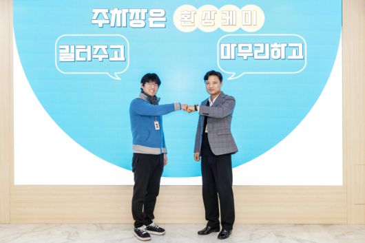 주차장은 환상 케미’ 배경 앞에 선 도시계획과 도시개발팀 두 공무원. 오른쪽이 전찬웅 팀장, 왼쪽이 문세영 팀장. 칠곡군 제공 |