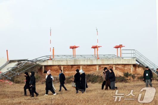 179명이 사망한 12·29 제주항공 무안공항 참사 1주기인 29일 전남 무안공항에서 유가족들이 활주로 내 피해를 키운 원인으로 지목된 방위각 시설물(로컬라이저)를 가까이서 바라보고 있다. 2025.12.29/뉴스1 ⓒ News1 박지현 기자 |