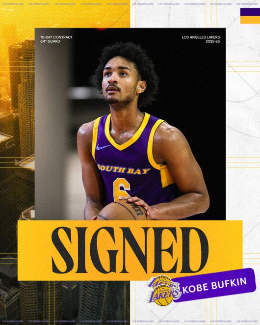 레이커스는 전력 공백을 보완하기 위해 G리그 사우스베이 레이커스에서 뛰고 있는 가드 코비 버프킨과 10일 계약을 체결했다. 버프킨은 시즌 초 멤피스 그리즐리스에서 이미 한 차례 콜업된 경험이 있으며, G리그에서의 활약을 바탕으로 레이커스 로스터에 합류하게 됐다.