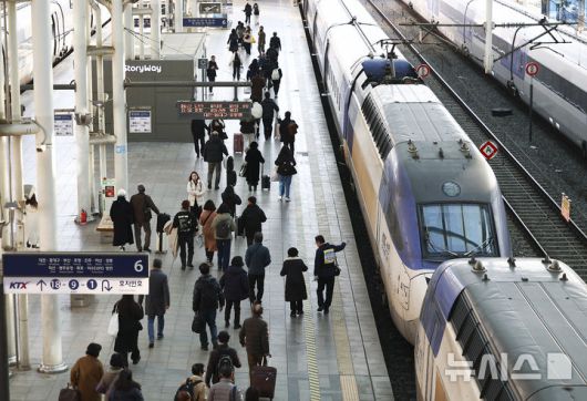 [서울=뉴시스] 김근수 기자 = 서울역 승강장에서 승객들이 KTX를 타기 위해 이동하고 있다. 2025.12.08. ks@newsis.com |