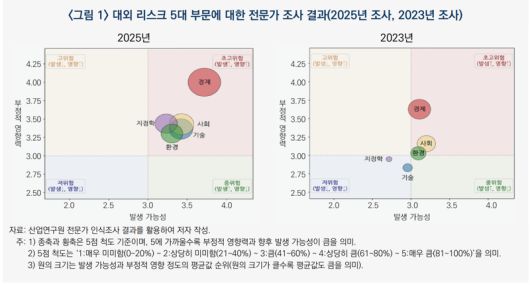 특히 이번 조사는 가장 최근 조사였던 2023년과 비교해 5대 리스크 부문 모두에서 위험 수준이 상승한 것이 특징이다. 경제 리스크는 부정적 영향력과 발생 가능성이 모두 3점 이상인 초고위험 구간으로 이동하며, 5대 리스크 가운데 2년 내 발생 가능성이 가장 큰 리스크로 평가됐다.