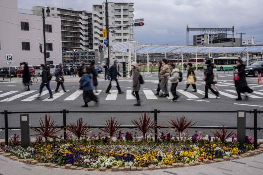 13일 일본 나라현에서 아베 신조 전 일본 총리가 선거 유세 연설 중 총에 맞아 사망한 긴테츠 야마토-사이다이지 역 앞 교차로에서 사람들이 기념비로 설치된 화단을 지나가고 있다. [AFP] |