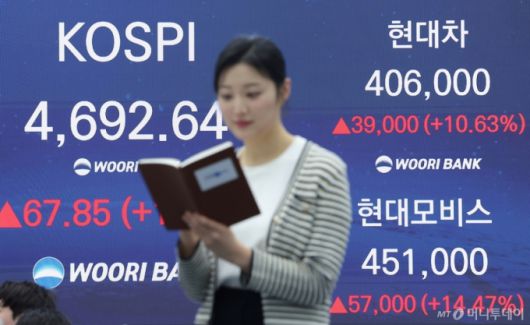 (서울=뉴스1) 김성진 기자 = 13일 오후 서울 중구 우리은행 본점 딜링룸 전광판에 증시 표시가 나오고 있다. 이날 코스피 지수는 전거래일 대비 67.85(1.47%) 포인트 상승한 4,692.64로 장을 마감했다. 코스닥은 전일 대비 0.83p(0.09%) 하락한 948.98로 마감했다. 서울외환시장에서 달러·원 환율은 전일 오후 3시 30분 주간종가 대비 5.3원 오른 1473.7원에 마감했다. 2026.1.13/뉴스1 Copyright (C) 뉴스1. All rights reserved. 무단 전재 및 재배포, AI학습 이용 금지. /사진=(서울=뉴스1) 김성진 기자 |