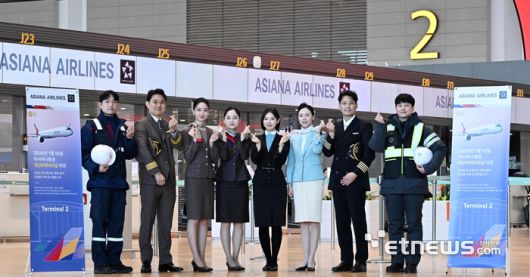 아시아나항공이 25년 만에 제2여객터미널(T2)로 이전했다. 아시아나항공이 제2여객터미널로 이전함에 따라 제1·2여객터미널 여객 비중은 65대 35에서 50대 50으로 균형을 이루게 됐다. 이전 첫 날인 14일 인천국제공항 T2 출국장에서 아시아나항공과 대한항공 직원들이 손하트를 그리며 손님을 맞이 하고 있다.