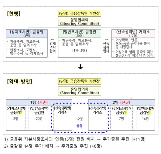 2팀 체제로 전환되면서 인력도 충원된다. 1팀 강제조사반에는 현재 자본시장조사과에 근무 중인 과장 및 조사공무원 전원(총 8명)을 배치하고 2팀 강제조사반에는 2026년 정기직제·2025년 수시직제에 따라 확보한 자본시장조사과 증원 인력(총 7명)을 배치할 계획이다.
