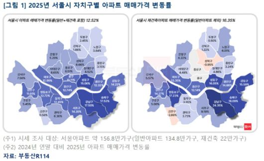 14일 부동산R114가 서울 아파트 매매가격 변동률을 조사한 결과, 2024년말 대비 2025년 아파트값은 12.52% 올랐다. 개별 자치구 중 송파구(17.52%)와 강남구(17.50%)가 각각 17% 이상 오르며 높은 상승률을 기록했고, 이어서 성동구(15.06%), 강동구(14.22%), 서초구(14.20%) 순으로 오름폭이 컸다.