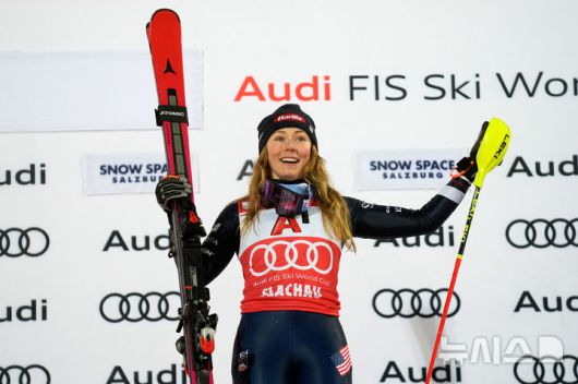 [플라하우=AP/뉴시스] 미국의 알파인스키 국가대표 미카엘라 시프린이 13일(현지 시간) 오스트리아 플라하우에서 열린 2025~2026 국제스키연맹(FIS) 알파인스키 월드컵 여자 회전 결선에서 우승을 차지한 후 기뻐하고 있다. 2026.01.14. |