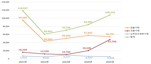 메자닌 증권 발행은 교환사채(EB)를 중심으로 크게 늘었다. 2025년 메자닌 증권 발행 규모는 10조8216억원으로 전년 대비 28.2% 증가했다. 전환사채(CB)는 5조4791억원으로 5.3% 감소했으나, 교환사채는 4조7789억원으로 1년 새 136% 급증하며 전체 증가를 주도했다. 신주인수권부사채(BW)는 5636억원으로 10.6% 줄었다.
